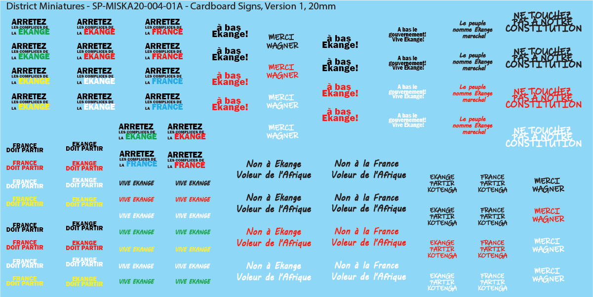 Decals for cardboard signs. These were designed off the lore from Miska Miniatures' Land Cruiser, from his excellent Kickstarter "Zanganie, Part 2". These fit well with the design of the environment of the lore. These are also based off real posters and murals found in referenced photos across African nations.