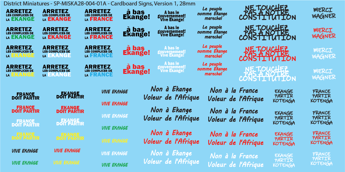 Decals for cardboard signs. These were designed off the lore from Miska Miniatures' Land Cruiser, from his excellent Kickstarter "Zanganie, Part 2". These fit well with the design of the environment of the lore. These are also based off real posters and murals found in referenced photos across African nations.