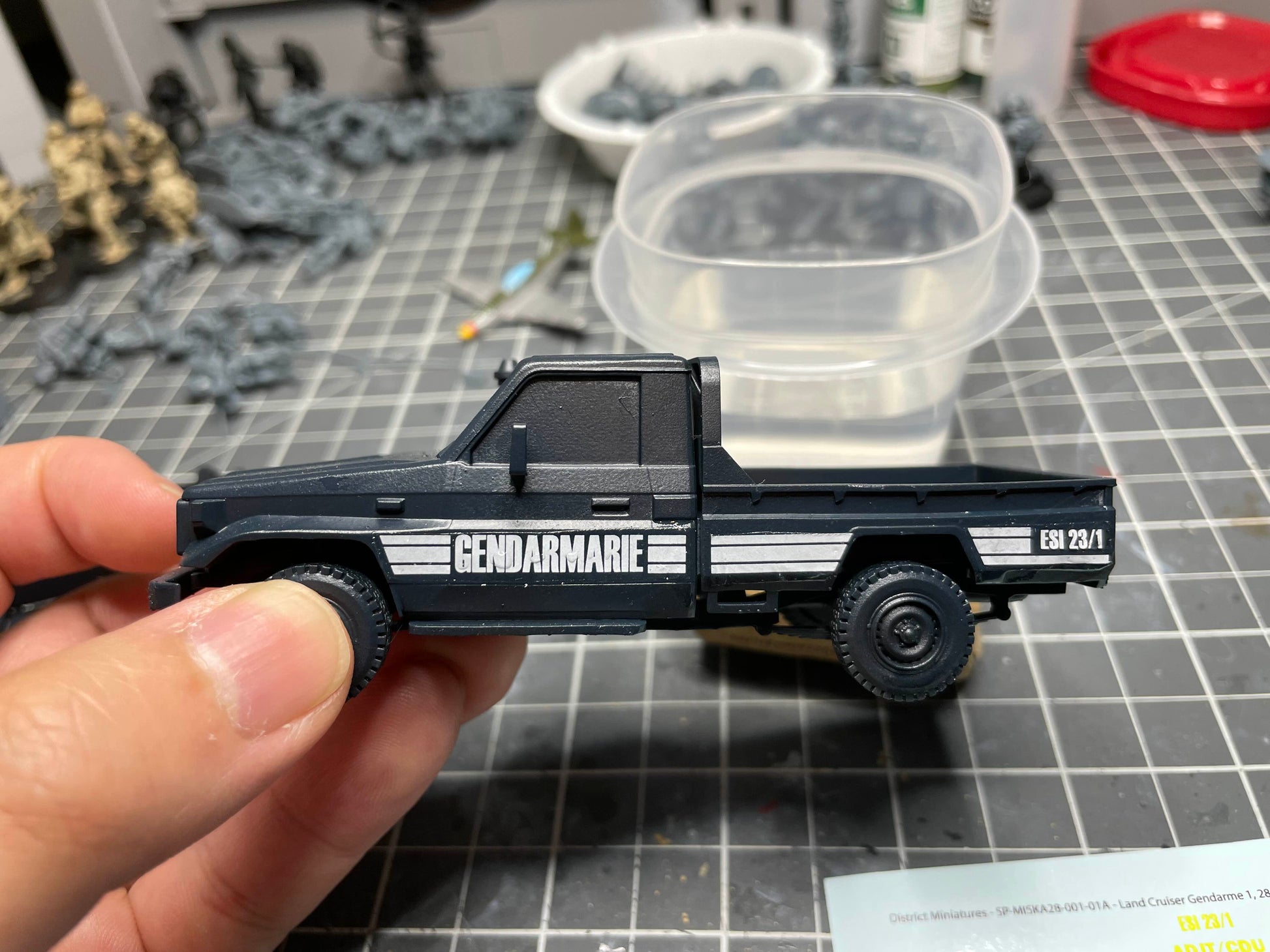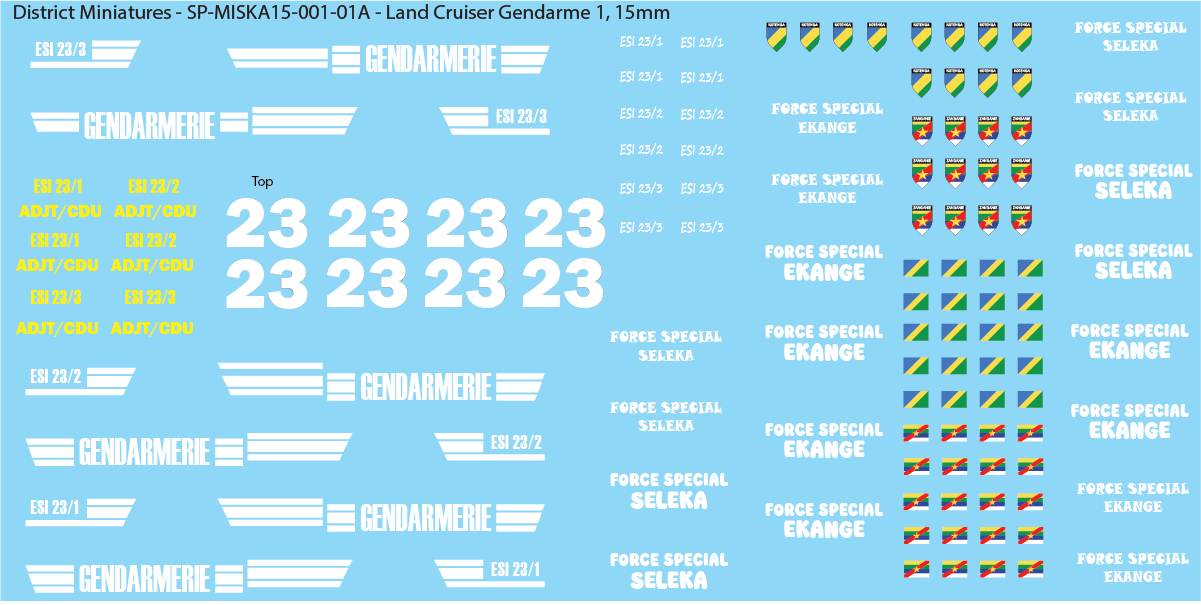 Included are a variety of police and gendarmerie options, as well as crest/flags for the Kotenga region or Zanganie forces. The large Force Special markings have been seen in reference photos to go on the side of the doors on the land cruiser.