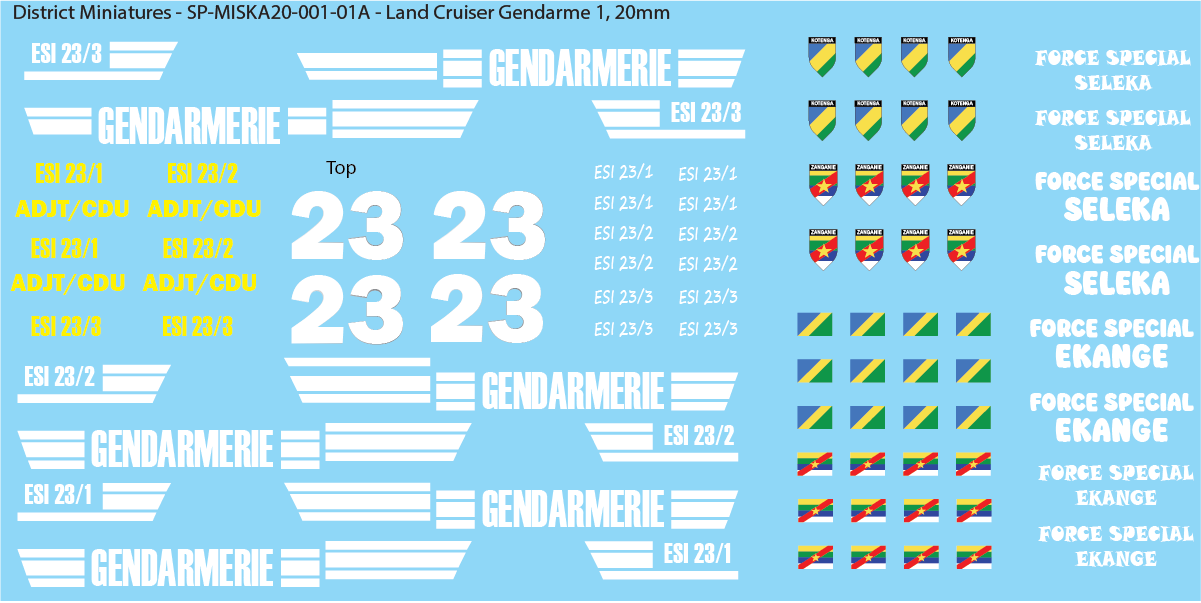 Included are a variety of police and gendarmerie options, as well as crest/flags for the Kotenga region or Zanganie forces. The large Force Special markings have been seen in reference photos to go on the side of the doors on the land cruiser.