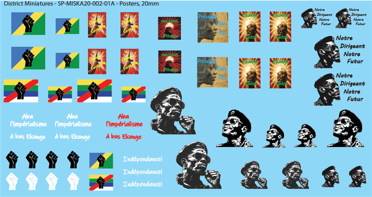 Decals for building posters/murals. These were designed off the lore from Miska Miniatures' Land Cruiser, from his excellent Kickstarter "Zanganie, Part 1" and "Zanganie, Part 2". These fit well with the design of the environment of the lore. These are also based off real posters and murals found in referenced photos across African nations.
