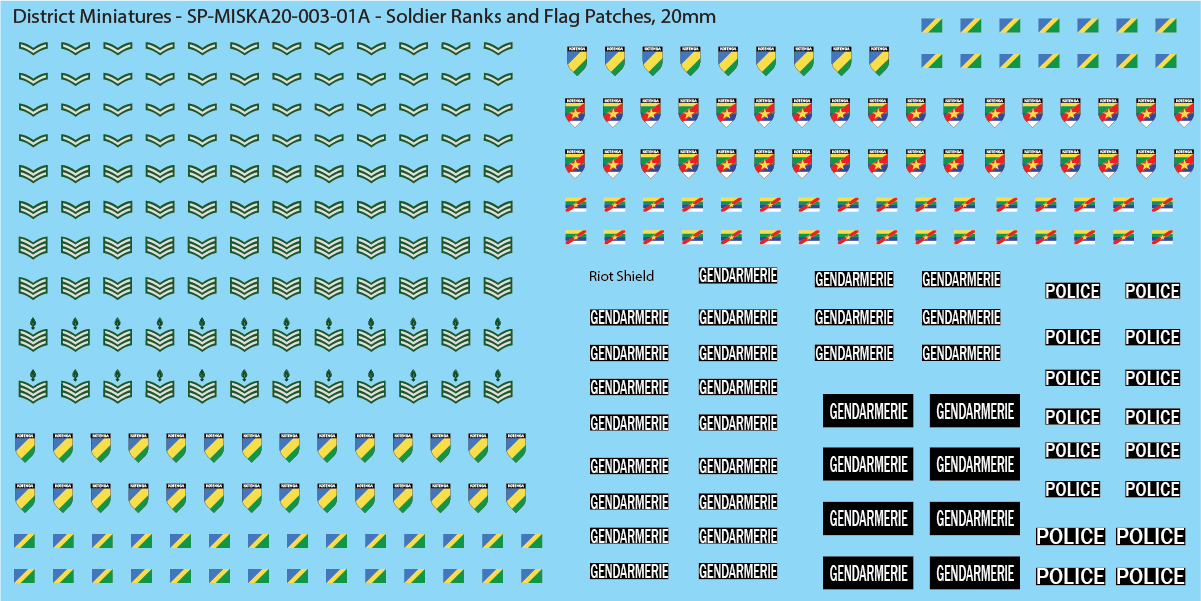 This sheet also includes Gendarmerie and Police decals that fit well on the hand-held shield for police riot gear from Miska Miniatures. Also included are the two different flag patches so you can decide which troops belong to which side of the war!
