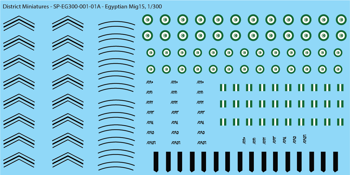 Decals for the Egyptian Air Force Mig15 in the Suez Crisis before the formation of the UAR when the roundels changed. These are meant to fit the Plane Printer Mig15bis model. Each sheet is meant for 6 aircraft + extras just in case.