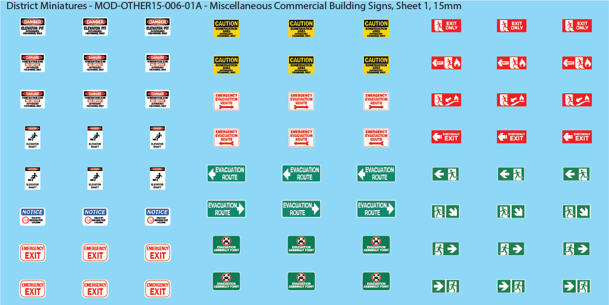 These are commercial signs found inside and on buildings. These range from exit and stairwell signs, fire exits, construction warnings, etc!