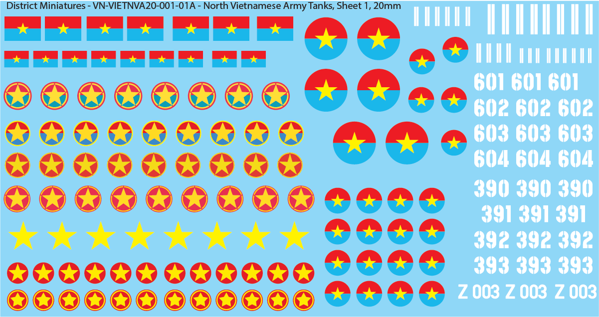 A decal variety sheet for North Vietnamese Army vehicles/tanks. Includes roundels, stars, flags, and tank numbers.