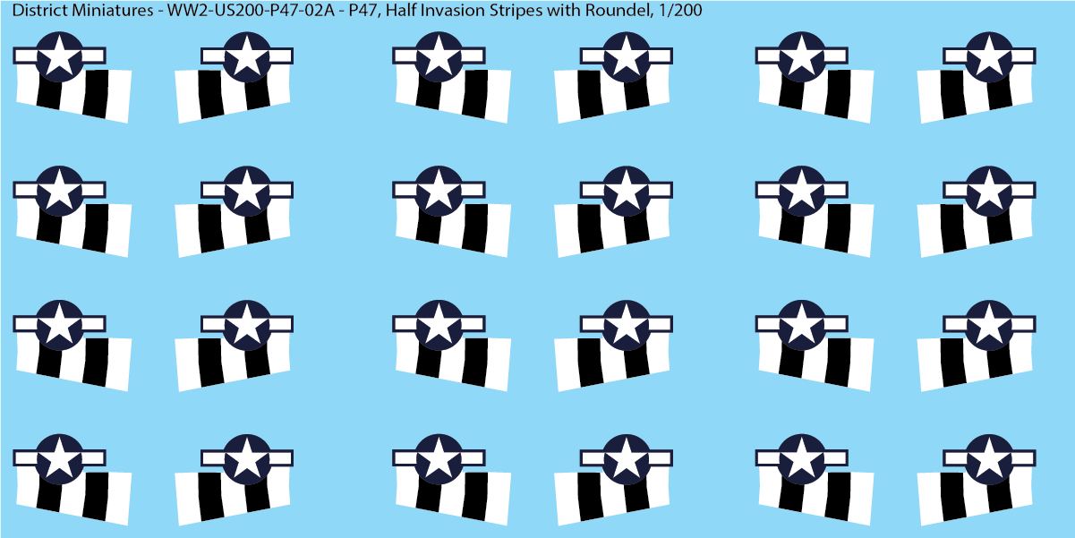 Decals are for 1/200 scale P-47 models. I have scaled these to fit perfectly on Plane Printer models. The tapered (thinner, vertically) part of the invasion stripe is towards the aft/rear of the aircraft, when applying the decal.