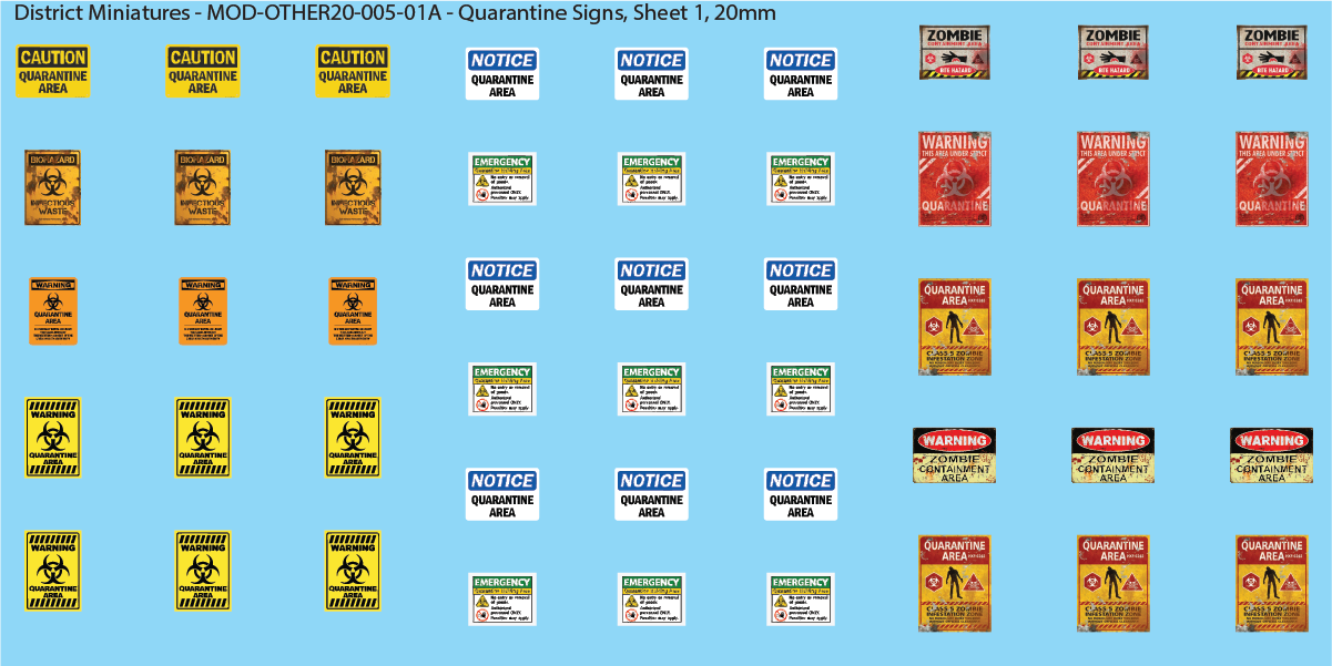 These are signs/posters for quarantine and zombies! These look great on terrain buildings and other scatter such as on trash dumpsters, doors, cars, etc.