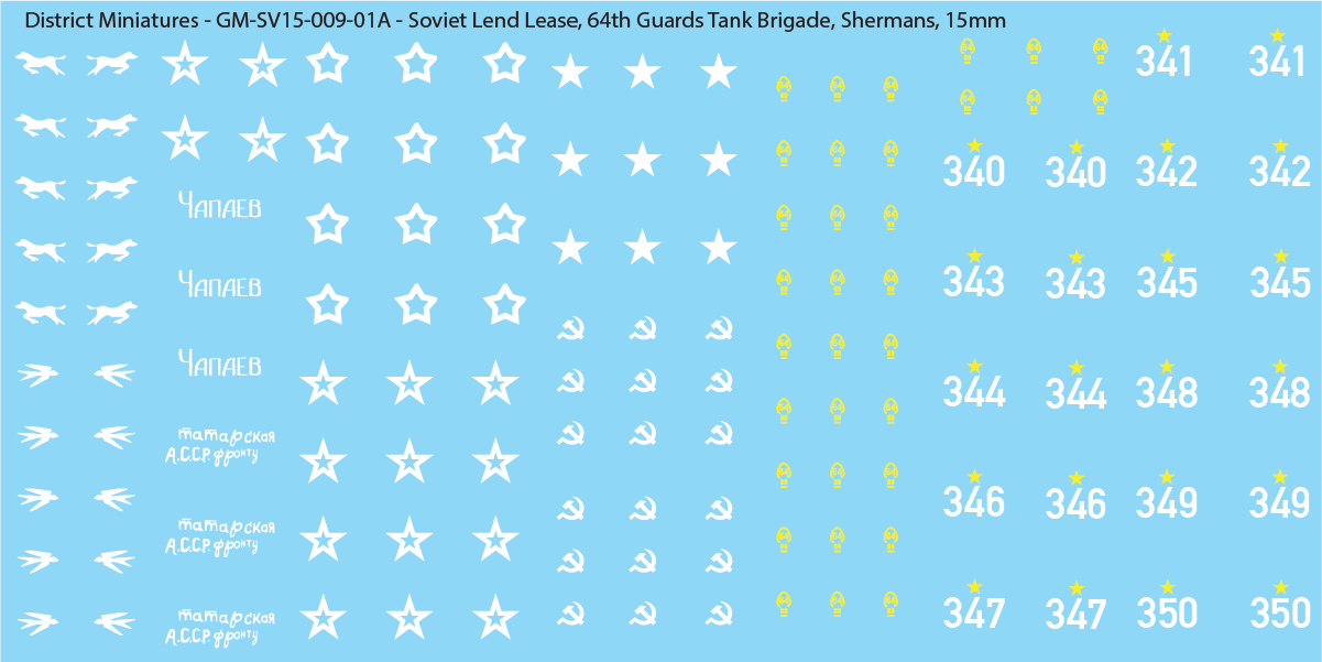Soviet lend lease decals for Shermans. Many USSR decals can be slapped onto Allied vehicles as most don't have unique markings. Some did have unique markings and these decals were made in hope to bring those back to life.