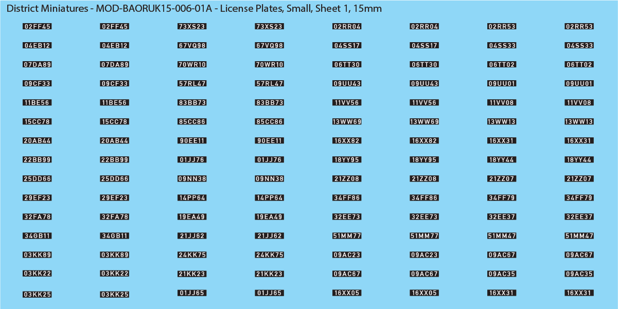 Decals for UK British Army of the Rhine (BAOR) license plates in 2 variants/sheets and 2 different sizes that will fit on Chieftains (large) and down to Scorpions (small).