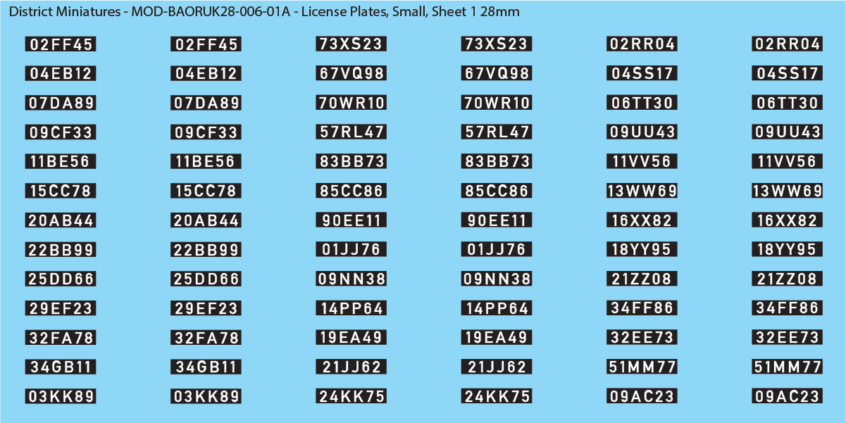 Decals for UK British Army of the Rhine (BAOR) license plates in 2 variants/sheets and 2 different sizes that will fit on Chieftains (large) and down to Scorpions (small).