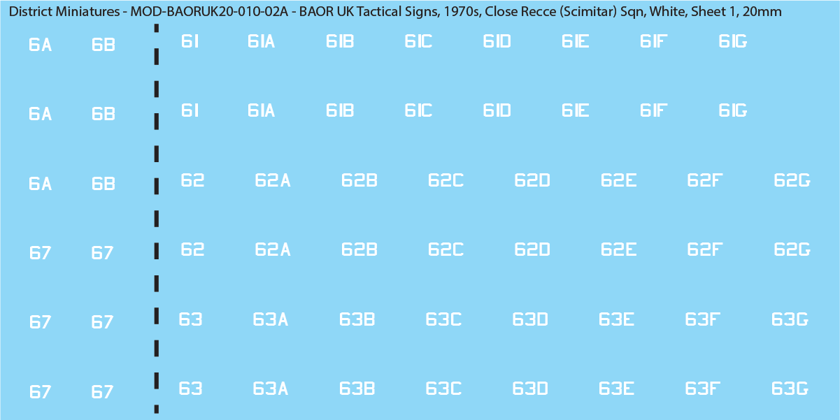 Decals for UK British Army of the Rhine (BAOR) close recce (scimitar) squadron tactical signs for the 1970s.