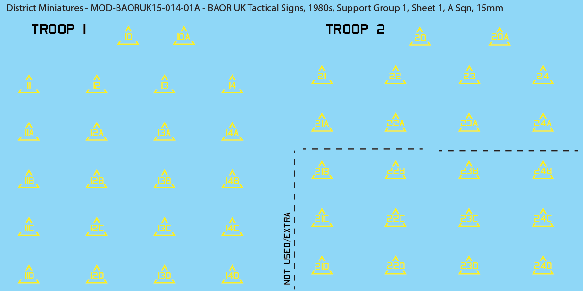 In the 1980s, the UK modified their armoured callsigns to be all yellow and retain the different symbols for each respective squadron (e.g., A SQN is a triangle). This change simplified the callsigns and modified the numbering in hopes to make it harder for OPFOR to understand. These decals are for 2 support groups, each with 2 sheets. These are also provided in each Squadron symbol.