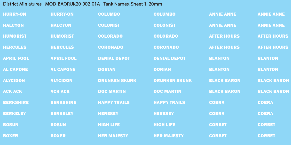 Decals for UK British Army of the Rhine (BAOR) tank names.