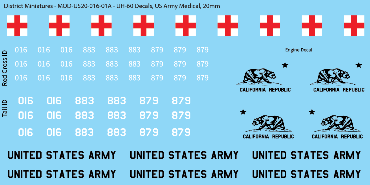 Decals for US Army UH-60 Blackhawk helicopters. These were designed to fit BobMack3D's UH-60 from the Flank March Miniatures REFORGER Kickstarter campaign and also fits ModernMiniatures.eu's blackhawk model. The Operation Gothic Serpent decals were based off real-life pictures of each UH-60. These also include each unique real-life tail numbers as well!