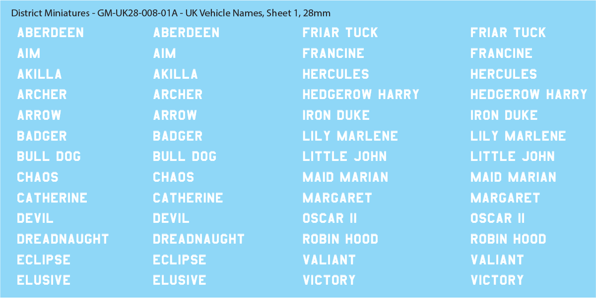 WW2 British - UK Vehicle Names, Multiple Variants, 28mm Decals