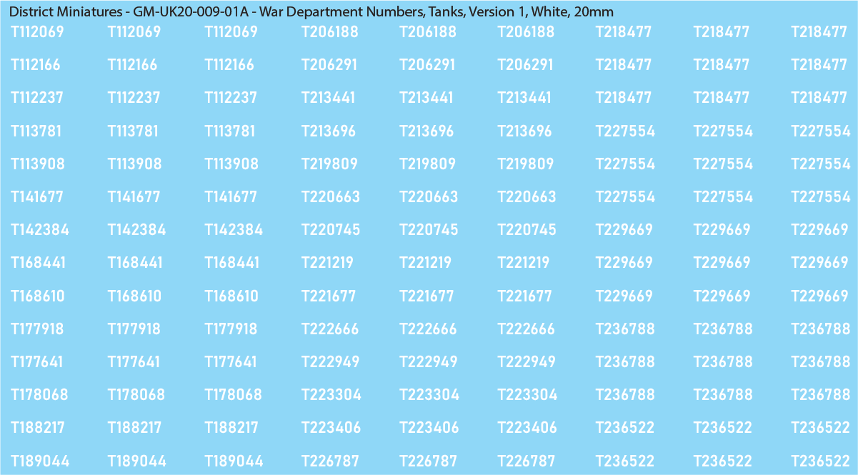 These are WW2 UK War Department Numbers for tanks. Comes in three different colors for each sheet (White, Yellow, Black).