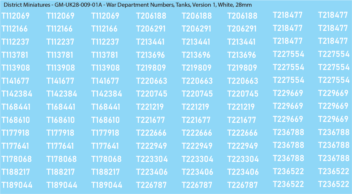 WW2 British - UK War Dept Numbers, Tanks, 28mm Decals