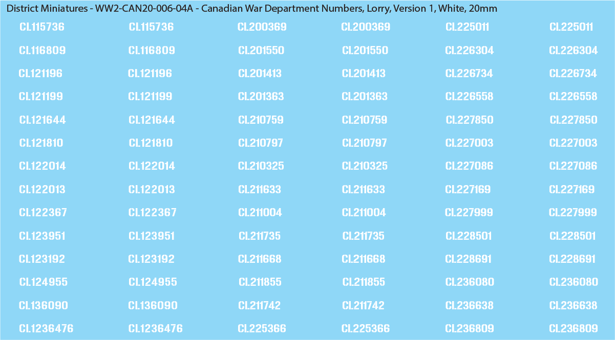 These are WW2 Canadian War Department Numbers for lorries. Comes in three different colors for each sheet (White, Yellow, Black).