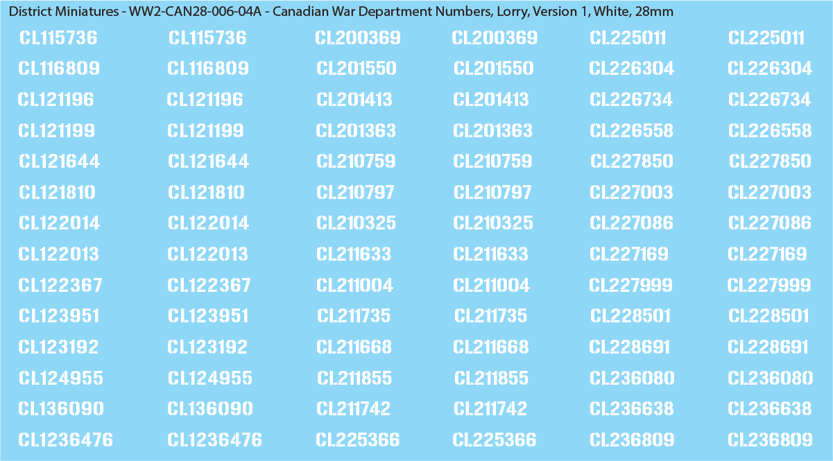 WW2 Canada - Canadian War Dept Numbers, Lorry, 28mm Decals
