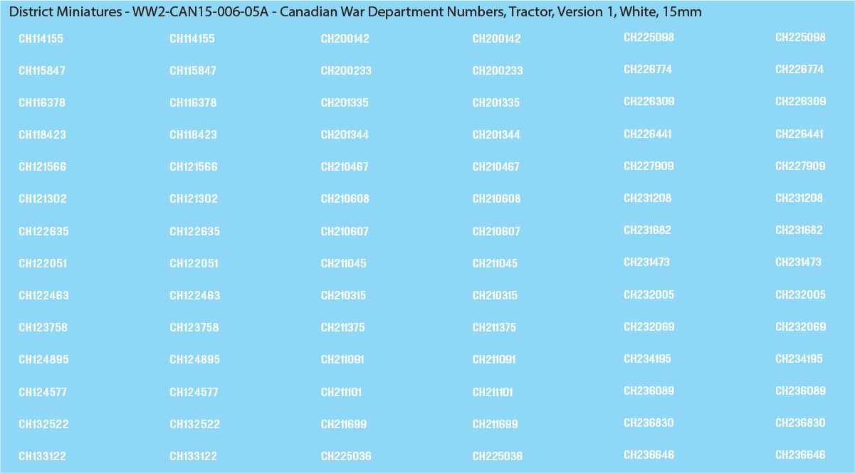 WW2 Canada - Canadian War Dept Numbers, Tractor, 15mm Decals
