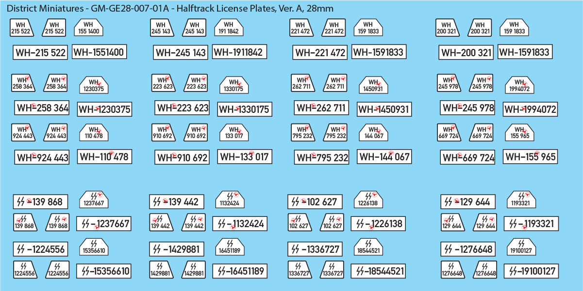 Decals for German halftrack license plates ranging in different style as well as plates for Wehrmacht and SS. These offer a variety of unique license plate numbering as well!