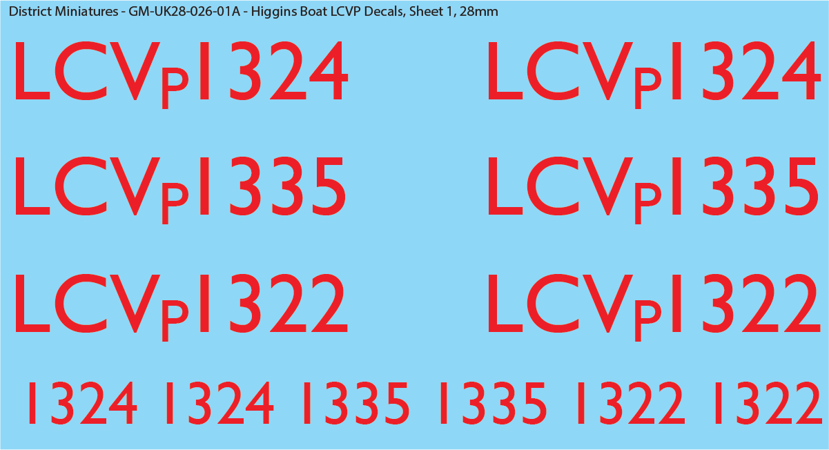Decals for WW2 UK higgins boat LCVP decals. The large numbers go on the side of the boat where the smaller numbers are for the rear of the boat.