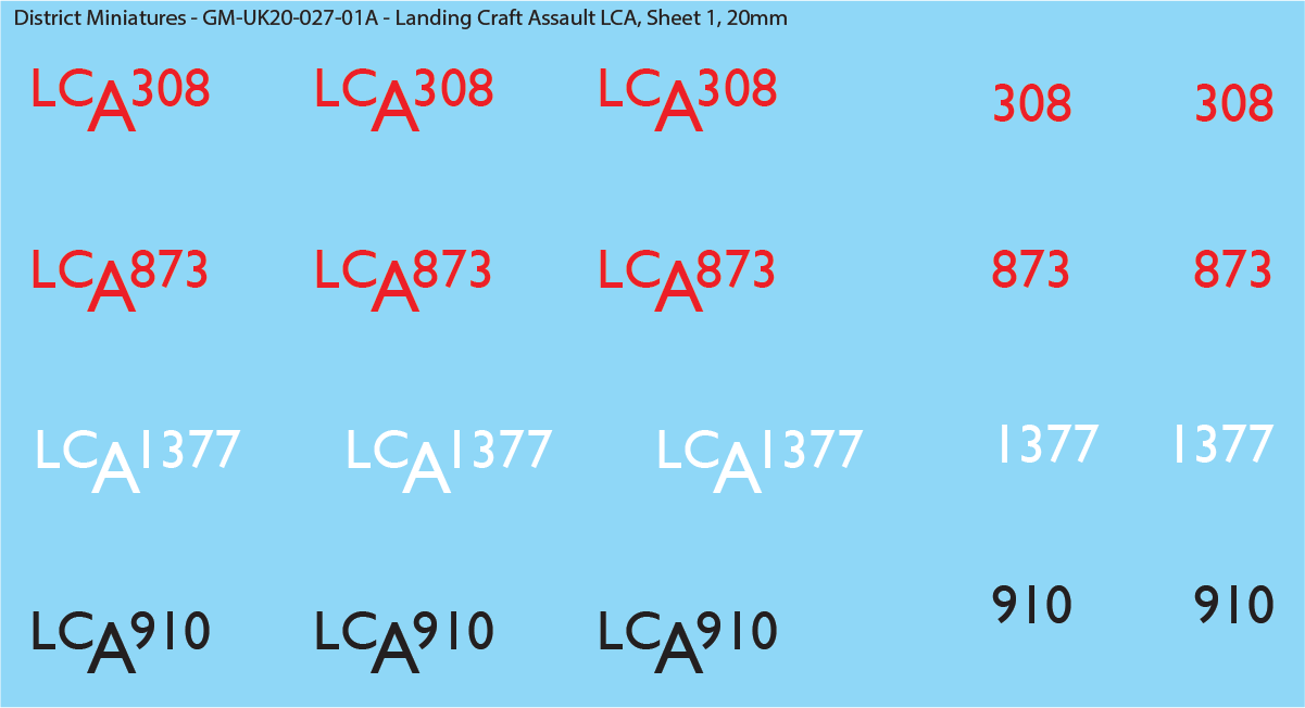 Decals for WW2 UK/Commonwealth landing craft decals. These include all other than LCVP (higgins) boats. LCTs were those very large landing craft tanks that brought massive equipment and troops to the beach. LCTs were much larger so the decals are also larger. LCMs were similar in which they brought troops and tanks to the beach. LCAs were similar to LCVPs in ferrying troops to the beach.