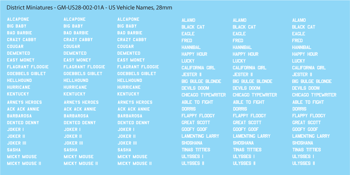 Decals for 15mm models. US vehicle names in both white and yellow!