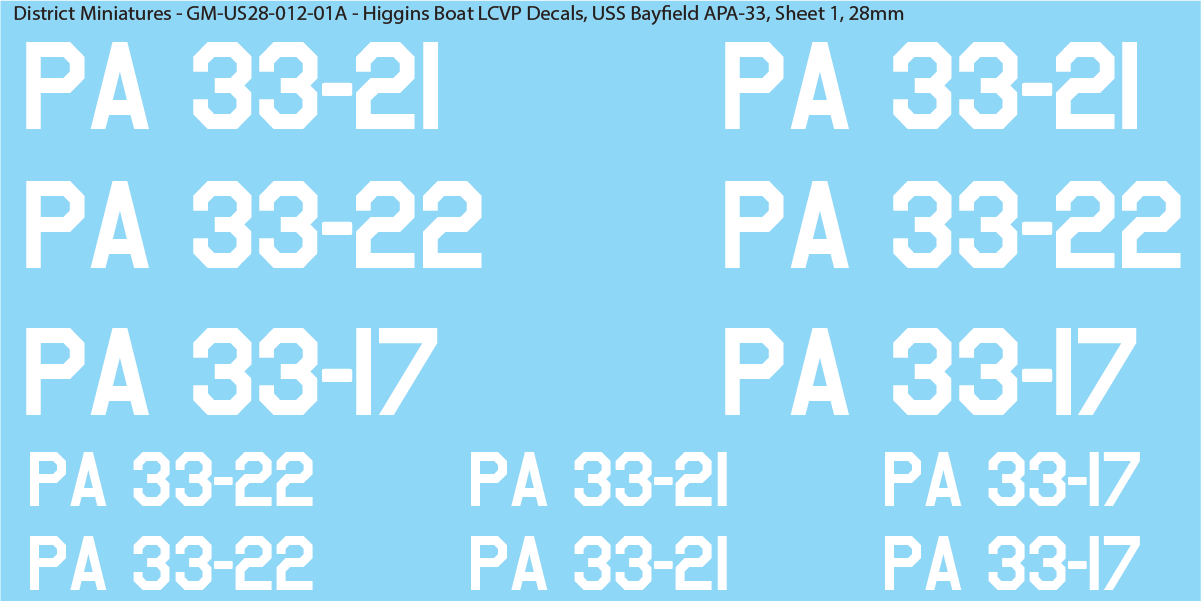 Decals for 28mm WW2 US higgins boat LCVP decals. Different sheets are available for different LCVPs from different ships. The large numbers go on the side of the boat where the smaller numbers are for the rear of the boat.