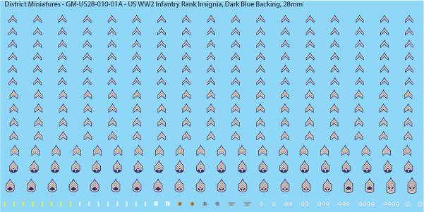 Decals for 28mm WW2 US Infantry Rank Insignia. The enlisted rank stripes are placed on the shoulder/sleeves and the officer insignia are to be placed on epaulettes, helmets, or collars.