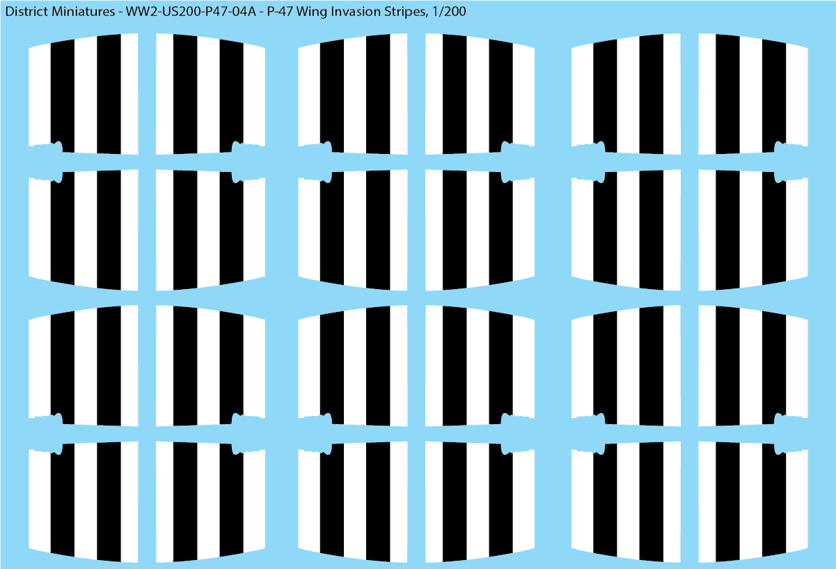 Decals are for 1/200 scale P-47 models. I have scaled these to fit perfectly on Plane Printer models. The invasion stripes are to be placed on the top and bottom of the plane. The notches in the decal signify where the gun barrels are on the wing so you can line up the decal perfectly.
