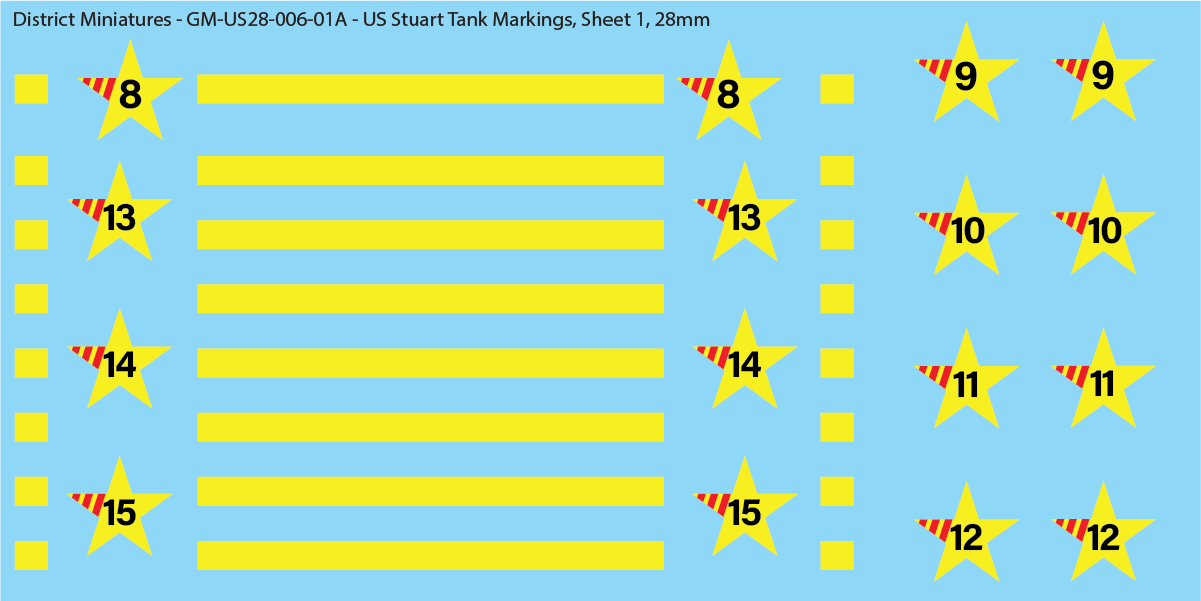 Decals for 28mm Stuart Tanks. You'll need to cut the yellow stripes to the length you'd like for your model. Generally, these go on around the turret. From reference material, the stars appear to be pretty large on the side of the small stuart turret, so i tried to mimic this in the decals :).