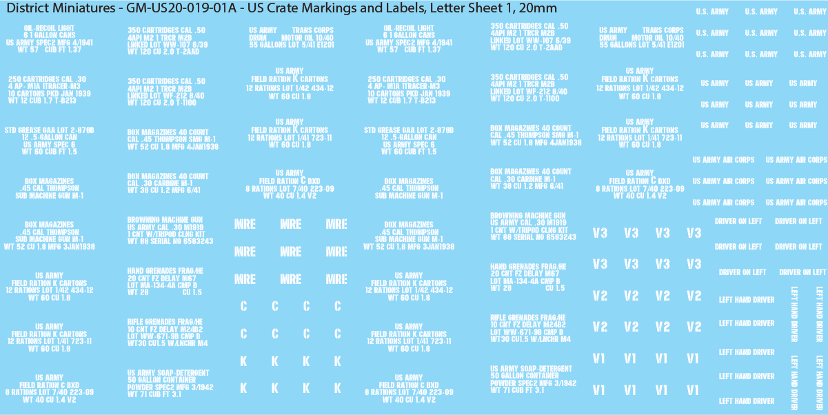 Decals for a variety of ammo and MRE/Ration crates and a few others! I've also included some extra decals for a variety of variations with a large K, C, V1-3 marking for easy identification. Additionally, I've included some miscellaneous decals for US Army, Air Corps, and others.