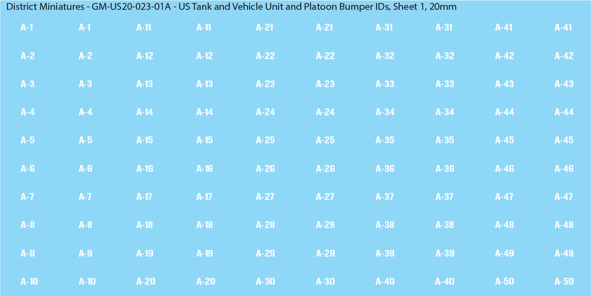 Decals for unit and platoon identification markings for US tanks and vehicles. These usually go on the bumper along with these bumper unit IDs decal sheets. These are the same height as well so they should match on your vehicles. For vehicles with smaller bumpers like jeeps and half tracks, going down 1 scale (e.g., 28mm to 20mm) may be best for it to fit on extremely thin bumpers depending on the model creator.